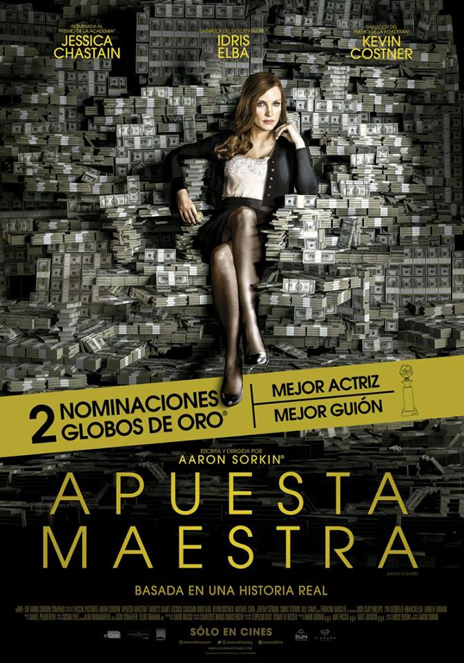 El recientemente nominado al Oscar por mejor adaptación de guión, Aaron Sorkin (“The west”, “Red social, “Steve Jobs”), lleva a la pantalla grande la conocida historia de Molly Bloom (Jessica Chastain), una brillante joven esquiadora olímpica que decide involucrarse en el negocio de las apuestas clandestinas, construyendo en pocos años y a través de un agitado y “non stop” modo de vida, un imperio en Los Ángeles y Nueva York.