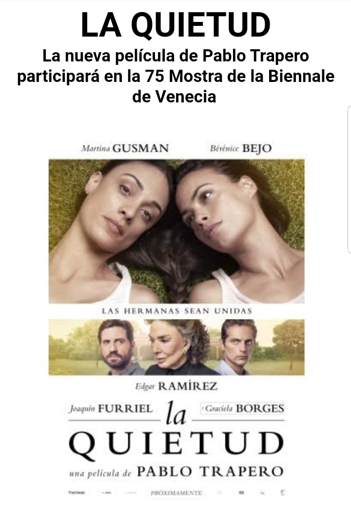 Durante la mañana del miércoles 25 de julio, se anunció que LA QUIETUD, la nueva película del director Pablo Trapero, fue seleccionada para participar del prestigioso Festival Internacional de Cine de Venecia, en lo que será la 75va edición de la Mostra Internazionale D’Arte Cinematográfica Di Venecia, que se llevará a cabo del 29 de agosto al 8 de septiembre.