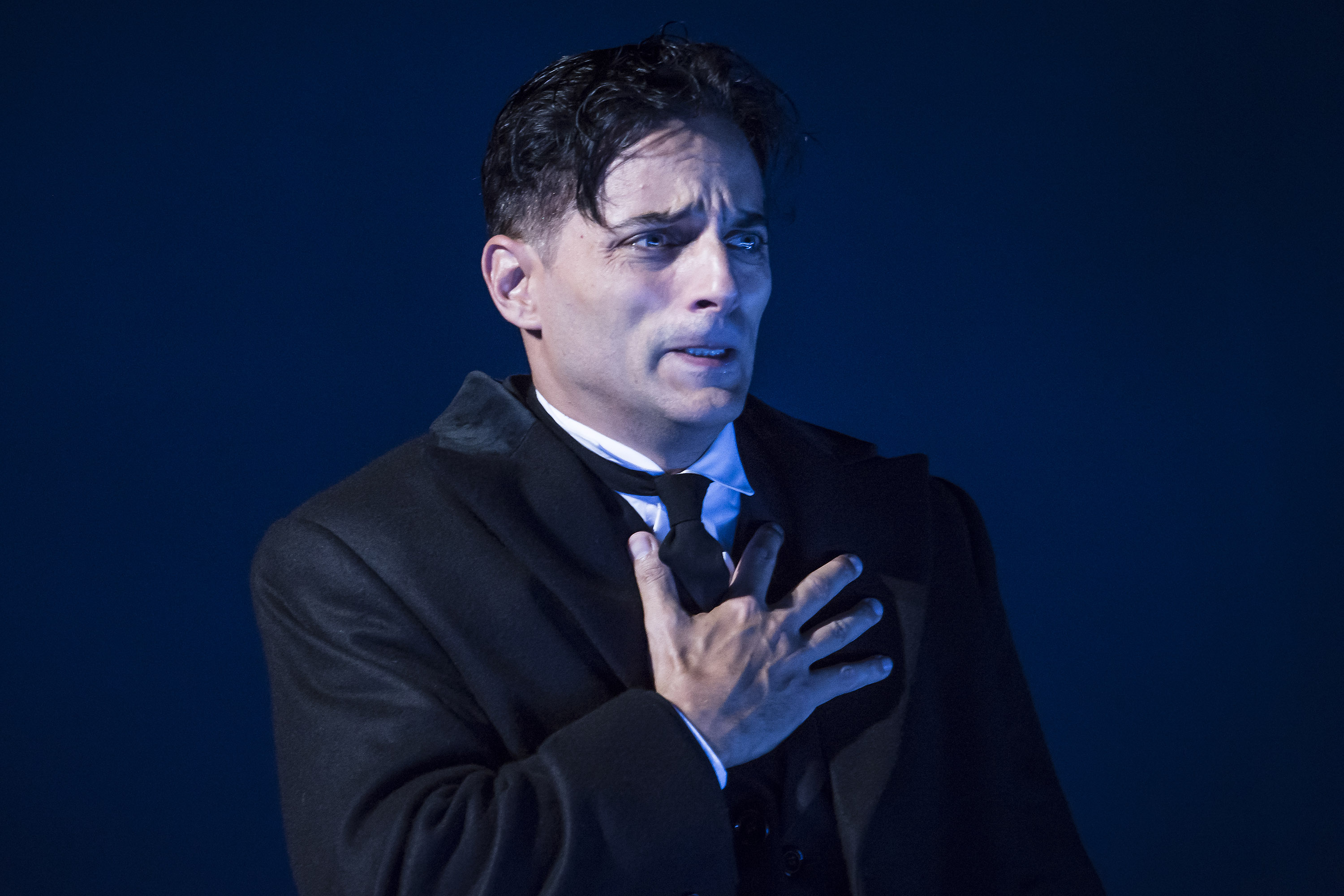 En una sala de tan grandes dimensiones, la gestualidad de los actores es imperceptible para la mayoría de los espectadores. La distancia entre los actores y el público dificulta la creación del clima intimista asociado con los soliloquios. Rompiendo con tradiciones escénicas, Furriel pronuncia su “ser o no ser” de pie (al menos en la función que vimos) y lo hace en el proscenio, con una fuerte luz que lo enceguece. Queda expuesto, a la vista de todos, como en un interrogatorio policial o un posteo en las redes, más vulnerable que nunca. Empatizamos a la vez con el personaje y con el actor.