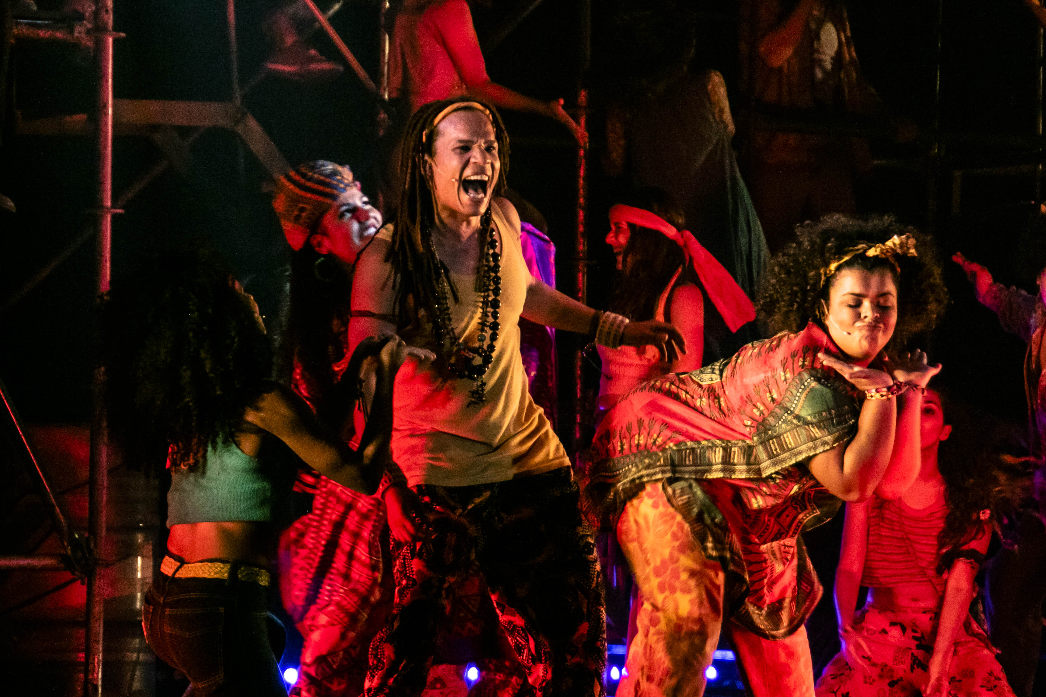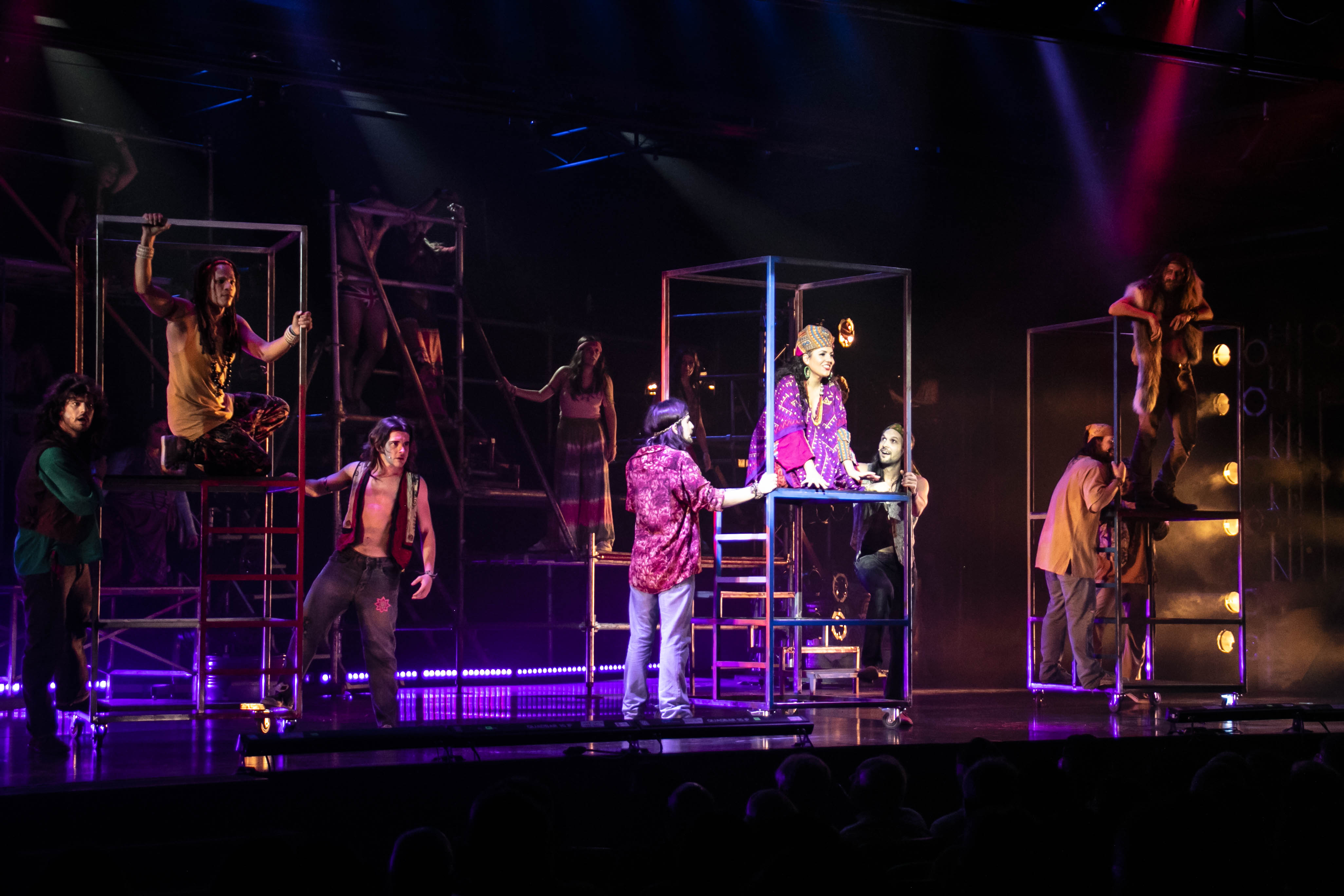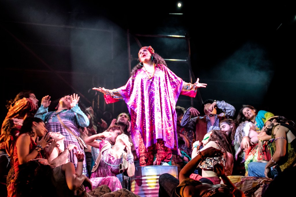 Si bien la filosofía antiprejuicios y el espíritu de igualdad, libertad y fraternidad de esta comunidad que les abre la puerta a todes y cuestiona las reglas de una sociedad rígida se conservan intactos, el libro por momentos cae en ciertos clichés que hace 50 años podían ser un mensaje muy potente y que hoy, por trillados, pierden fuerza y resultan un tanto naíf. En la puesta, resulta interesante la escenografía con estructuras de caño y la iluminación que convierte a toda la enorme sala en el escenario de la acción, además del vestuario que nos ayuda a hacer un viaje en el tiempo a la época del flower power.