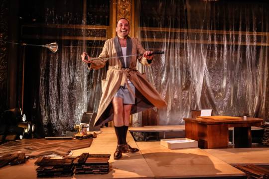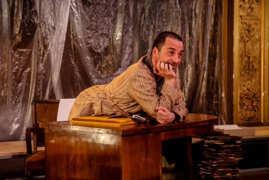 La mirada maestra de Marilú Marini desde la dirección cataliza la alquimia de recursos y acciones que transmutan este texto extraordinariamente rico e intrincado a la dramaturgia. Los elementos escenográficos se desparraman por la sala Luisa Vehil y plasman la deconstrucción del personaje en un desorden de objetos y andamios. El protagonista, palo de golf en mano, destruye (concreta y simbólicamente) su obra; a lo largo de la interpretación desnuda un maniquí imaginario, hecho de prejuicios burgueses y excusas rimbombantes, y se disfraza de señorito de moño y saco pied de poule, listo para arremeter contra el mundo desde la mesa de algún café literario.