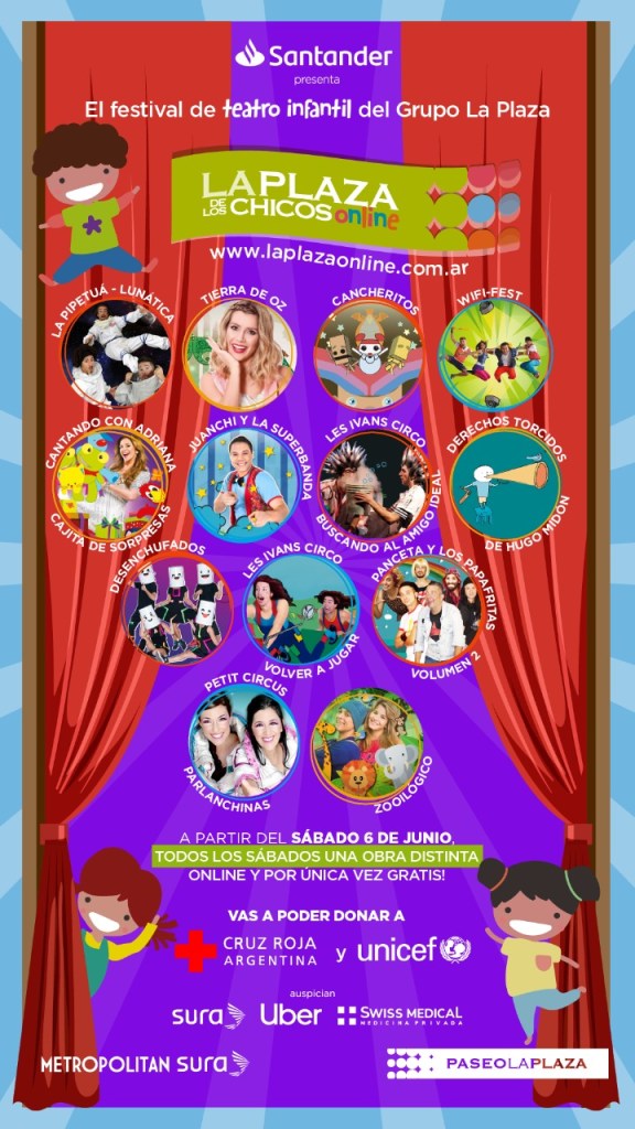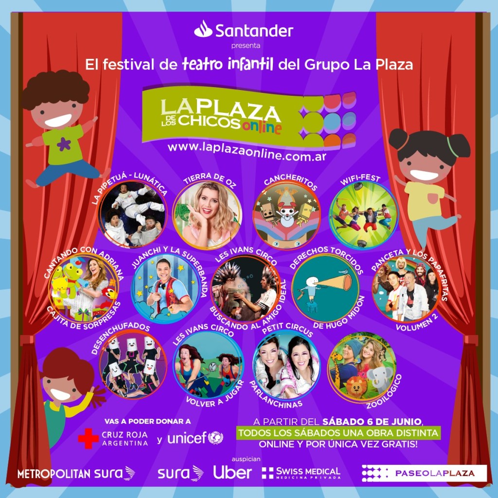 LA PLAZA DE LOS CHICOS ONLINE es parte de la Temporada Teatral LA PLAZA ONLINE y cuenta los auspicios de Santander, Sura, Swiss Medical Group y Uber; y con el apoyo y la participación de los autores y elencos de cada una de las obras.