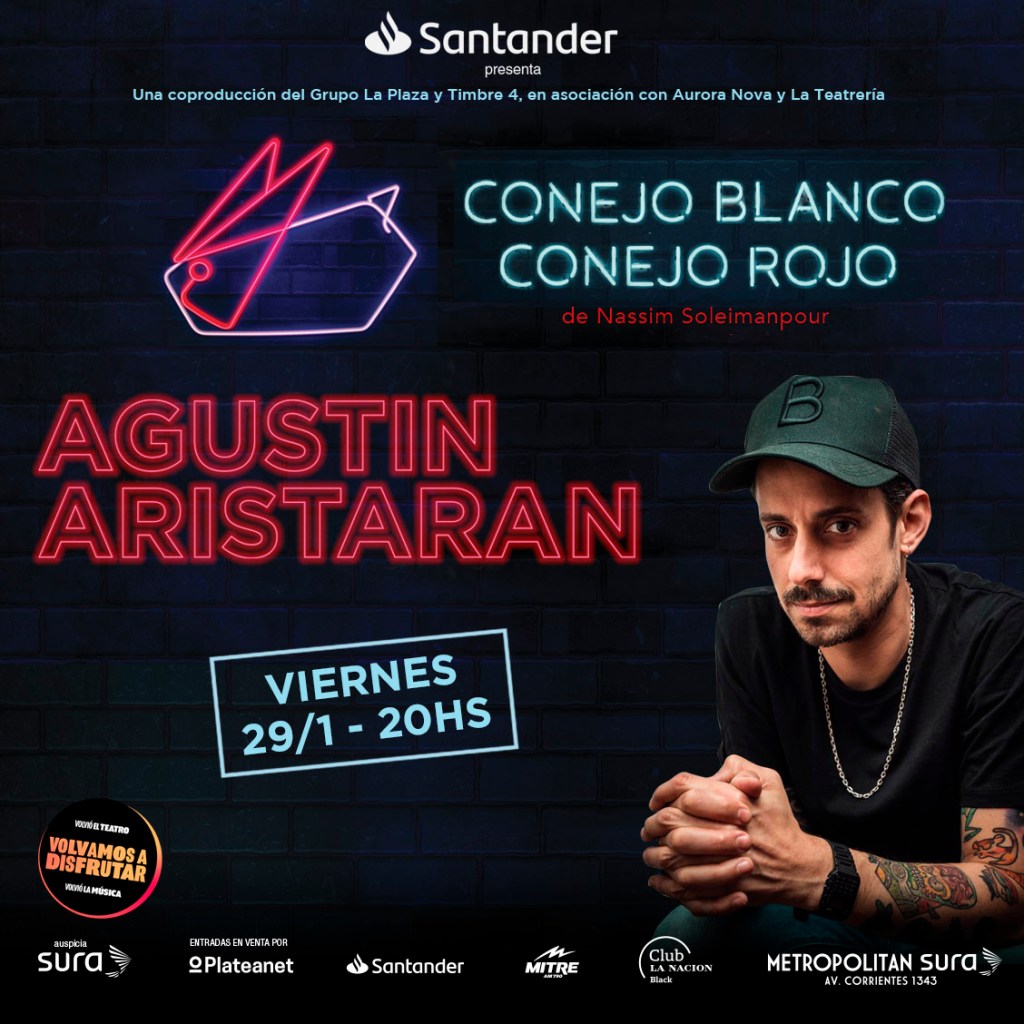 Después de un casi un año de extrañar las tablas y las butacas, en este enero de 2021, protocolo y aforo mediante, pudimos volver a las salas de teatro, y ayer estuve en la función de «Conejo Blanco, Conejo Rojo» del autor iraní Nassim Soleimanpour, que sube al escenario de la sala principal del Metropolitan Sura en Calle Corrientes los viernes de enero y febrero de 2021 a las 20hs., gracias a una nueva co-producción entre el teatro Metropolitan Sura del Grupo La Plaza (www.metropolitansura.com.ar) y Timbre 4, en asociación para esta producción con Aurora Nova y La Teatrería.