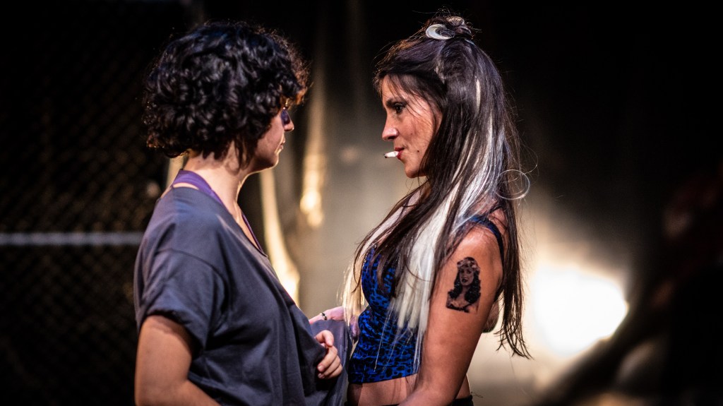 La poesía no solo se manifiesta en los parlamentos en verso, sino también en otros elementos, como el vestuario, que uniforma a todo el grupo con camperas de diferentes colores y capuchas que les permiten ocultar sus rostros y jugar con las sombras de un submundo oscuro, para hacer foco en una aguda visión del conflicto social. El uso del espacio y la iluminación juegan un rol fundamental y expresivo en toda la puesta, particularmente en la escena sublime del soliloquio de Mike, bajo un reflector que proyecta su sombra agigantada sobre la pared que ominosamente muestra el cartel verde de SALIDA, o las velitas regadas por el piso en la escena final con todo el ensamble, que se luce con performances muy sólidas. Excelente “tragedia musical”, mezcla de Amor sin barreras y Euforia, al ritmo de cumbia villera con reminiscencias de Los Redondos.