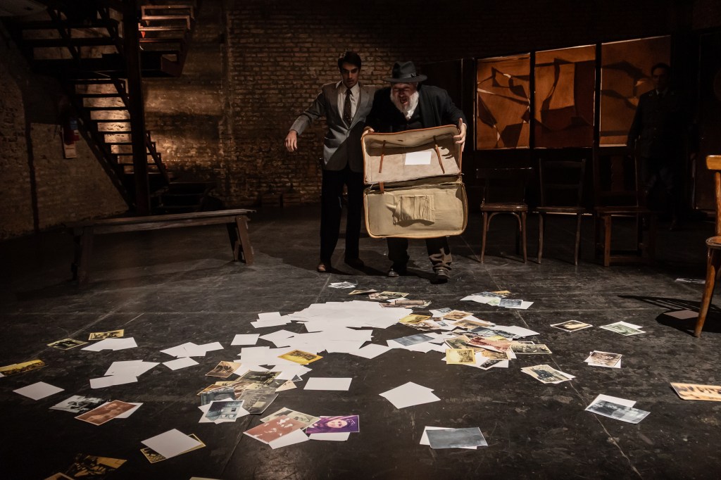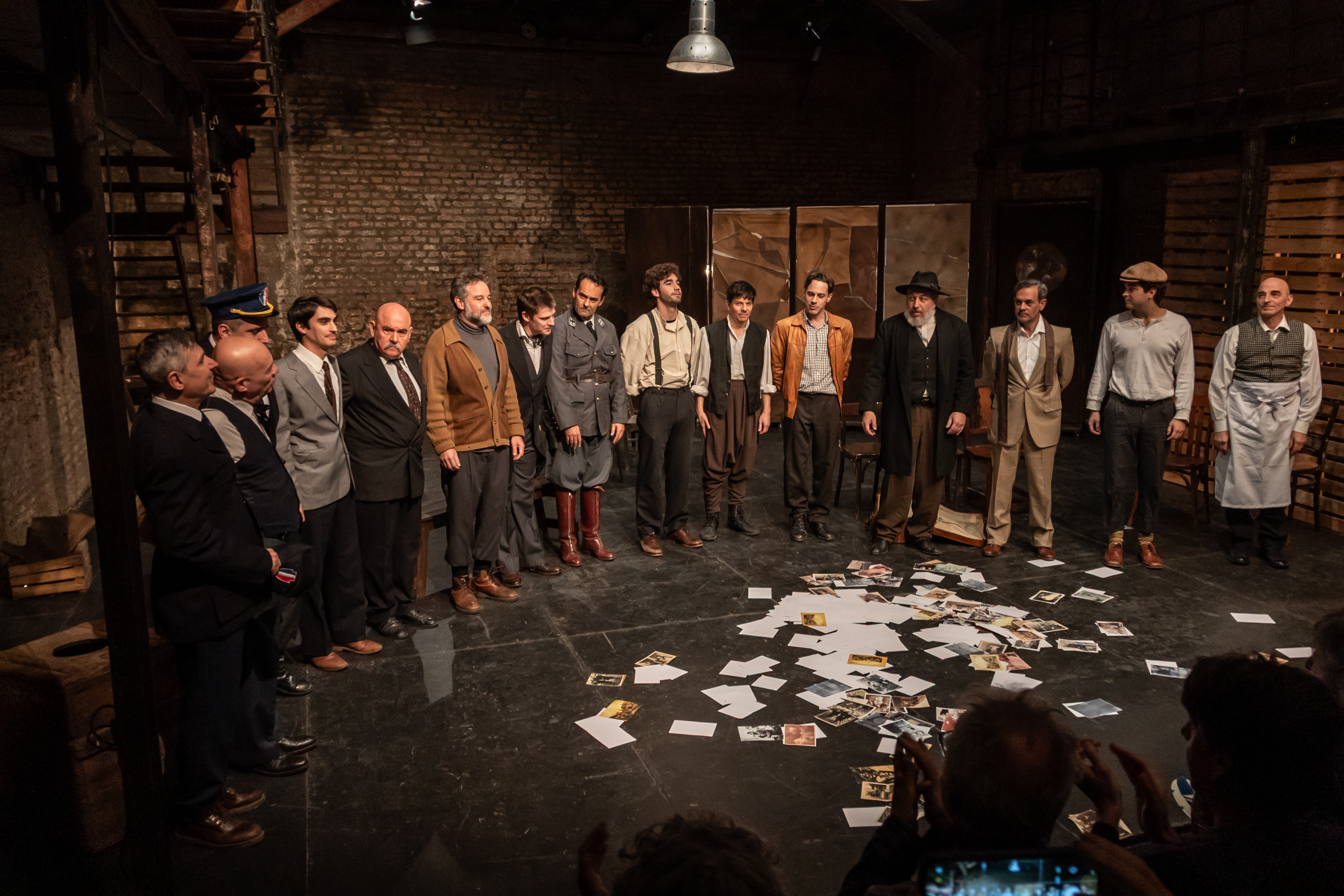 Miller construye arquetipos de personajes. En la puesta conviven, en bandos bien marcados, el Capitán, el Inspector, el profesor de antropología racial, un Comandante, policías, y por otro lado, un judío ortodoxo que reza en idish, el aristocrático vienés, el psiquiatra, el artista, el socialista, un mozo, un adolescente de clase humilde, un gitano, y un actor. A medida que son obligados a pasar a una sala donde son interrogados, la mayoría no vuelve a aparecer en escena. A partir de esos cuerpos que se ausentan y el texto dramático que hilvana la historia, se construye el horror. ¿Dónde van? ¿Qué hacen ahí adentro? ¿Qué les piden? Miller no da muchas vueltas y disipa las posibles preguntas que uno pueda hacerse.