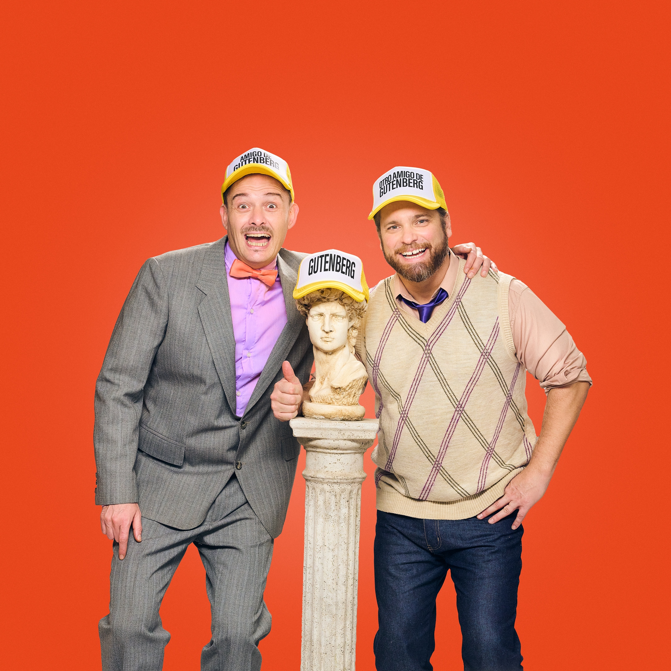Pero el componente fundamental es la dupla protagónica integrada por Germán Tripel, ganador de un Premio ACE Revelación en Teatro (2010) por Hedwig and the Angry Inch e integrante del elenco de Forever Young desde hace varios años, y Santiago Otero Ramos, ganador de un Premio Hugo al Mejor Intérprete Masculino en Musical Off y un premio ACE Revelación Masculina por su trabajo en Asesinato para Dos, junto con el maestro Hernán Matorra en el piano y músicos en escena. Germán y Santiago encuentran en Gutenberg un medio propicio para dar rienda suelta a su costado más lúdico, su espontaneidad y su gran timing para la comedia. Su talento musical, sumado a su estilo irreverente, logra un combo explosivamente divertido, en esta comedia del off tan disparatada como exigente, en donde literalmente transpiran la camiseta al multiplicarse en una decena de roles (+ pueblo), a lo largo de 90 minutos de diversión sin atenuantes.