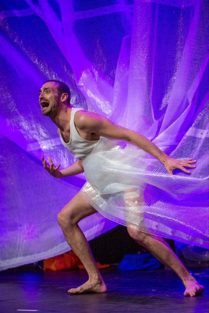 La escenografía está marcada por una tela blanca que representa el interior de una casa y funciona como un backstage para que el intérprete pueda alterar su vestuario, transitar entre escenas o marcar transiciones. Las múltiples funciones de este elemento, tan bien pensado como ejecutado, son fruto de la labor de Rosso junto a Oria Puppo, quien también diseñó las luces, otro rubro técnico fundamental que potencia la performance.